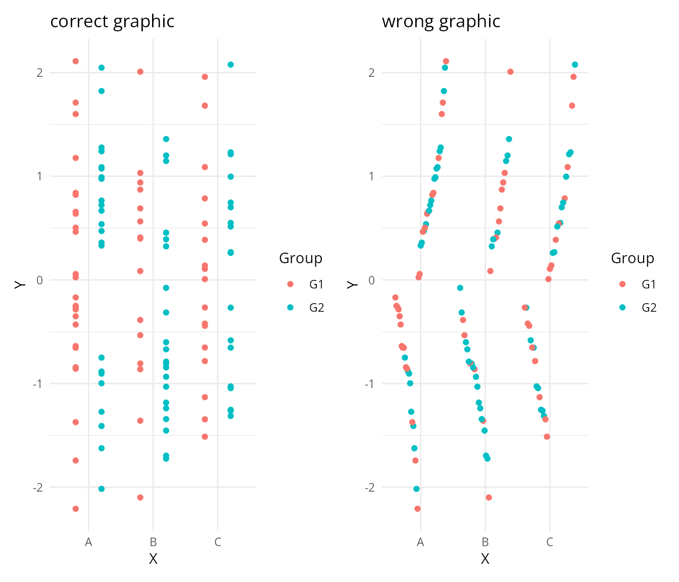mapping = aes(tooltip = my_tooltip, group = interaction(factor1, factor2))The illustration below demonstrates the problem. The left plot specifies group = interaction(X, Group) explicitly — dodging works. The right plot omits group, so ggplot2 includes tooltip (which is unique per point) in the grouping, and dodging breaks: